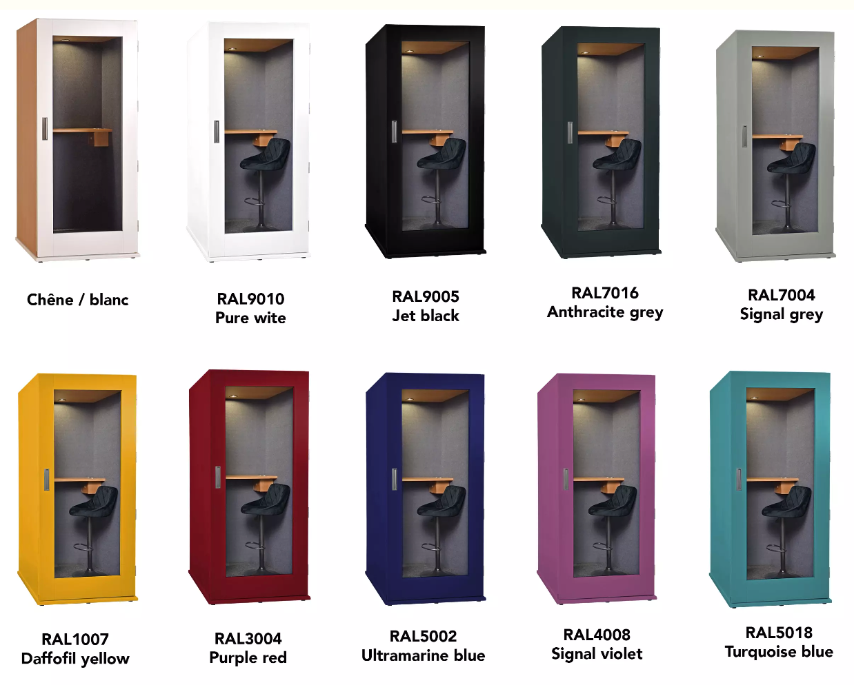 Finition intérieure tissu acoustique feutrine gris anthracite. Finition extérieure +1000 couleurs possibles, contactez-nous pour une demande spécifique.